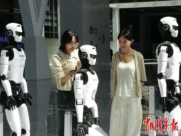 9月20日,郑州航空港区华夏国际会展核心,两位参不雅者饶有兴味地取机械人进行互动。中青报·中青网记者 李桂杰/摄